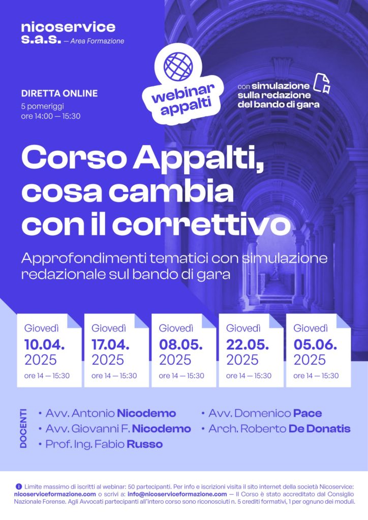 A fronte di tale incessante evoluzione, e, per affrontare le nuove emergenze di formazione, confronto e aggiornamento, la nostra Società ha deciso di realizzare un NUOVO CORSO/CONFRONTO DI STUDI ED AGGIORNAMENTO DEDICATO AL DIRITTO DEGLI APPALTI PUBBLICI con particolare riferimento alle NOVITÀ che apporta il cd. “Correttivo Appalti” al d. lgs. n. 36/2023 (Codice dei contratti pubblici).